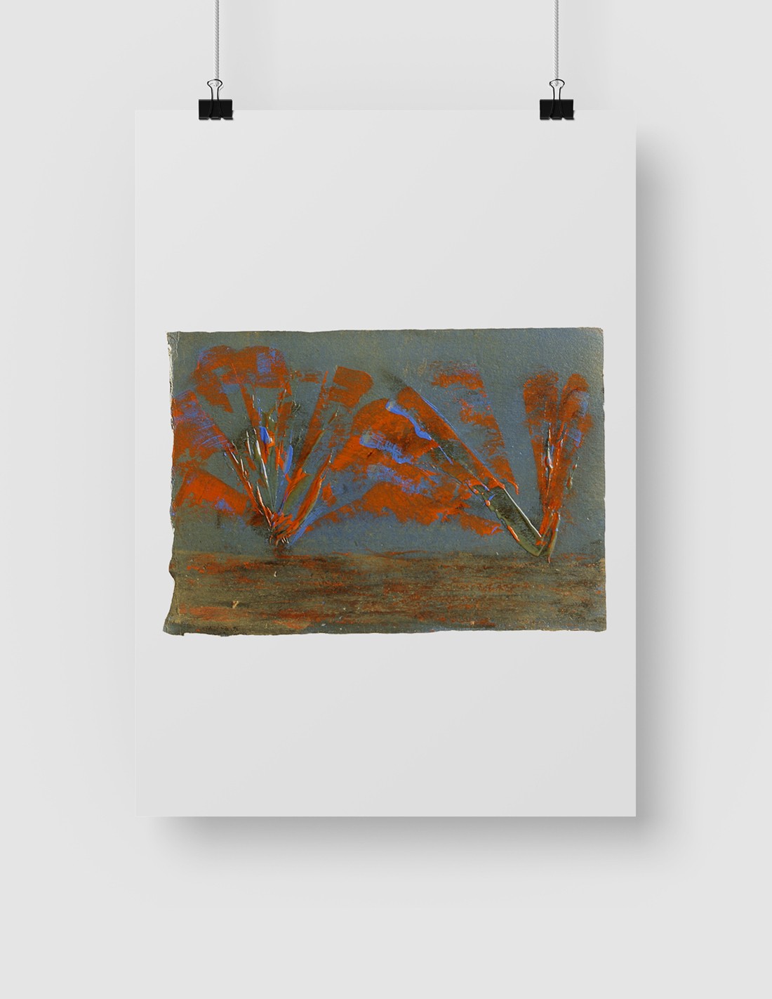 Art abstrait, peinture acrylique texturée travaillée dans la masse. Tons brun, bleu, orange, bitume de Judée. Portrait intime rafraîchissant.
