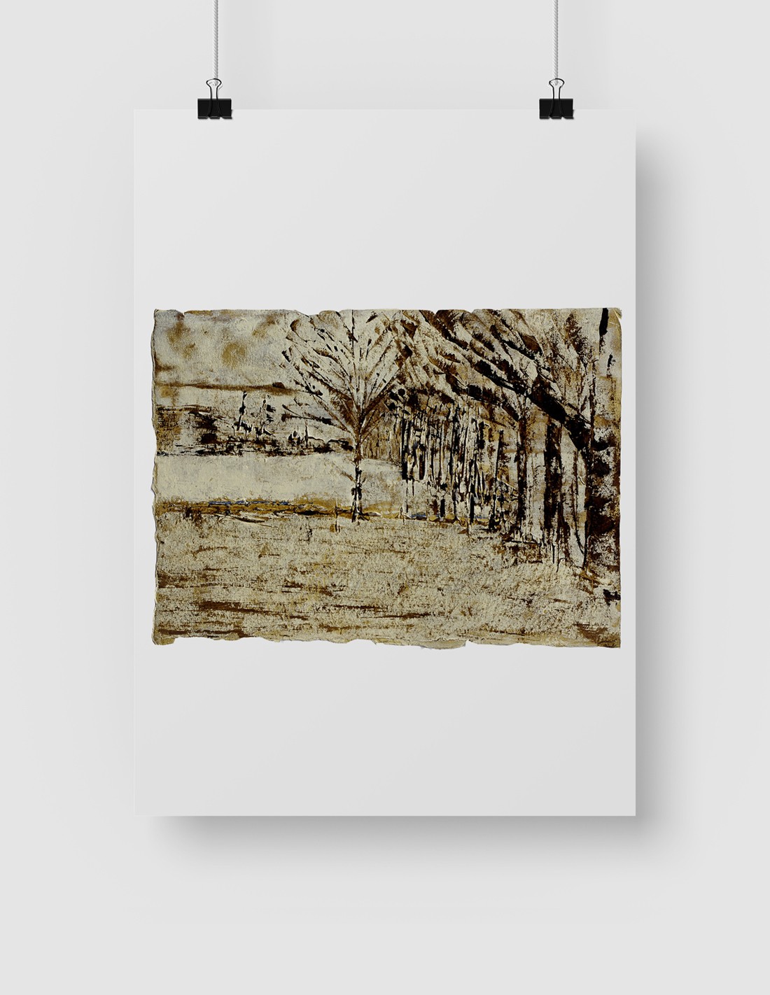 Art abstrait, peinture acrylique texturée travaillée dans la masse. Tons terre de sienne, bitume de Judée. Vision dans les prairies.