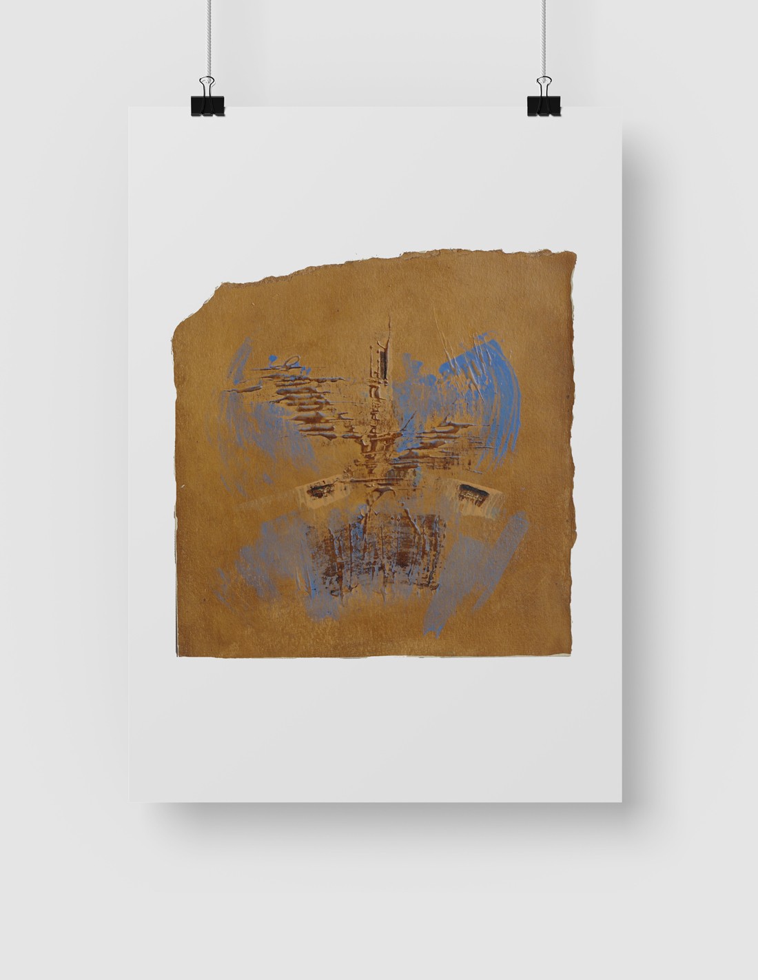 Art abstrait, peinture acrylique texturée travaillée dans la masse. Tons ocre orange et bleu, bitume de Judée. Tête de Mort, Art Brut.