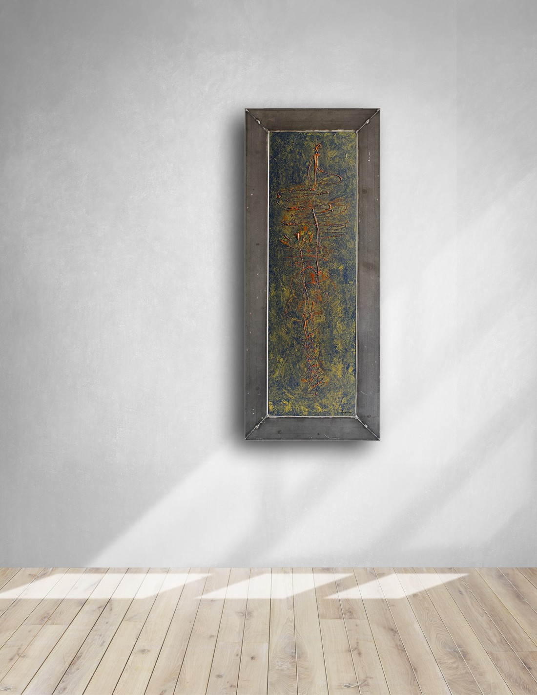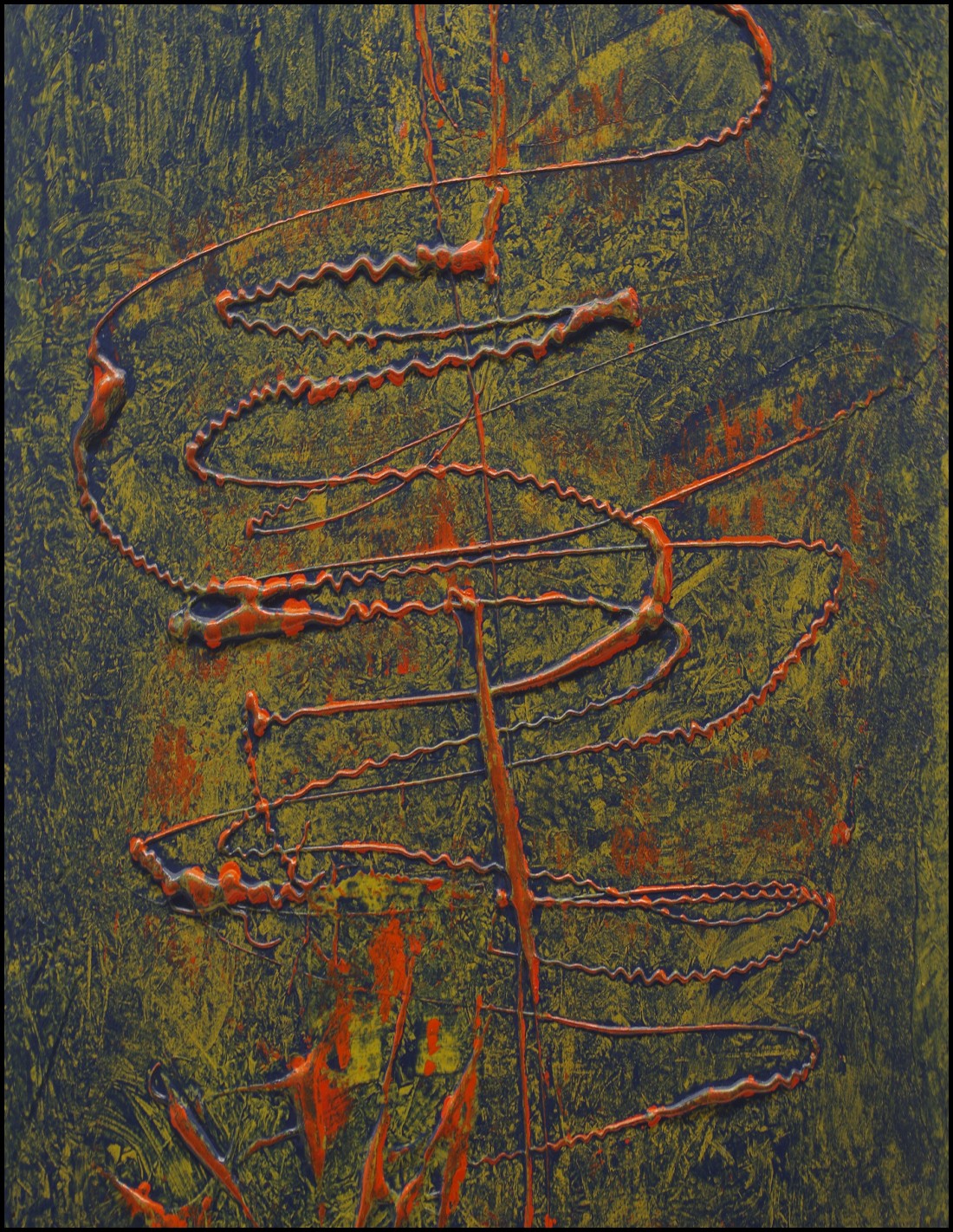 Art abstrait peinture acrylique texturée sur carton. Tons orange et bleu, bitume de Judée. Mouvement de danse.