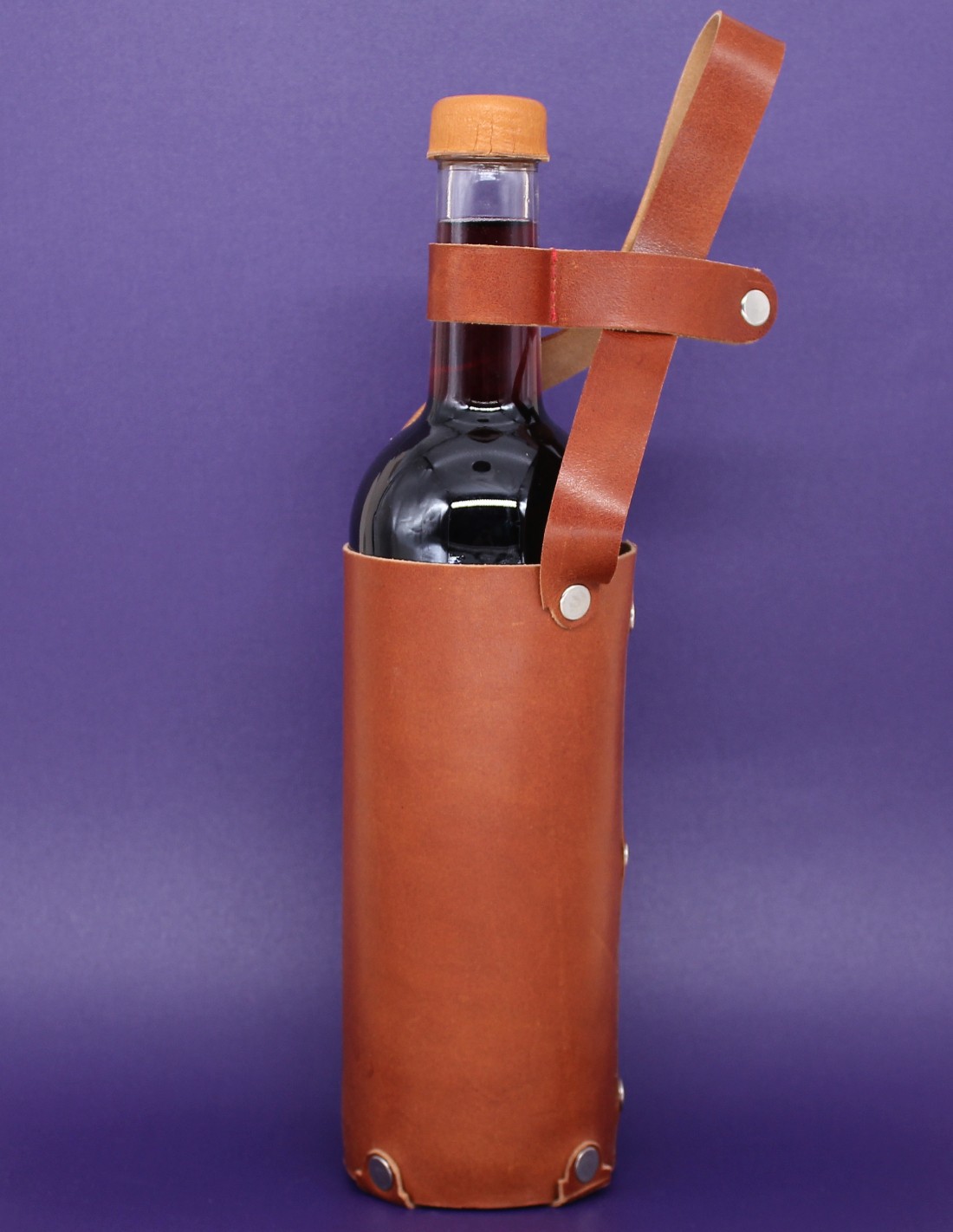 Ce porte-bouteille de vin en cuir lisse couleur marron est pratique avec son anse anti goutte.