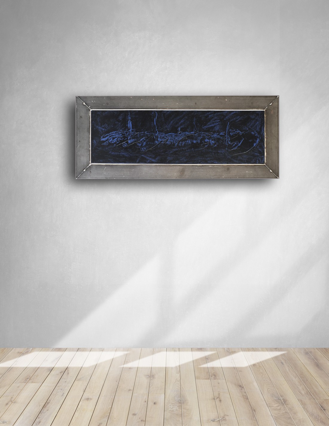 Art abstrait peinture acrylique texturée sur support carton et châssis aggloméré. Tons noir et bleu, bitume de Judée.