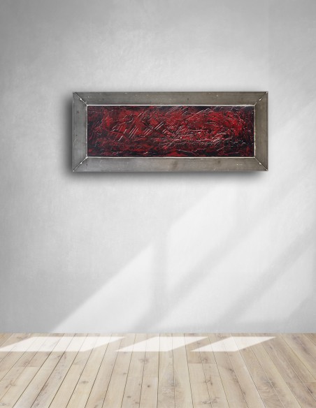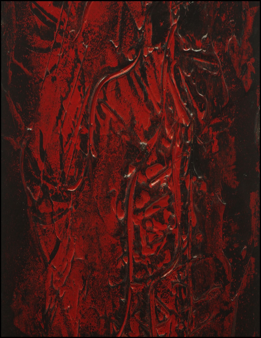 Art abstrait peinture acrylique texturée sur support carton et châssis aggloméré. Tons noir et rouge, bitume de Judée.
